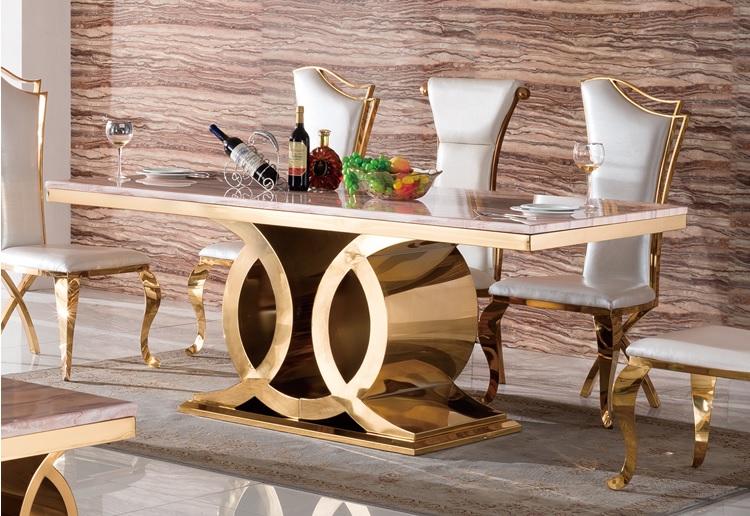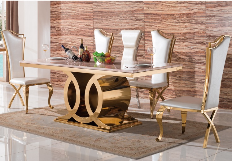 欧式餐桌餐椅时尚前卫的风格款式,注重细节的创意设计,精心挑选了304不锈钢制造奢华镀金餐桌餐椅,具有超级强悍的承重力,不变形不生锈,无甲醛无辐射无气味,环保绿色,给家人及客户一个安全温馨的就餐环境。高档餐厅、咖啡馆、大型餐饮、酒楼歌厅、购物广场皆适用。鑫广意餐桌餐椅定制厂家为奢华镀金餐桌餐椅赋予了巧妙设计心思,气质典雅高档,防撞击防虫蛀、不容易被腐蚀、使用寿命可达数十年,艺术之美可收藏传承。 餐桌餐椅等西餐厅家具全国配送,心动不如行动,欢迎来图定制。